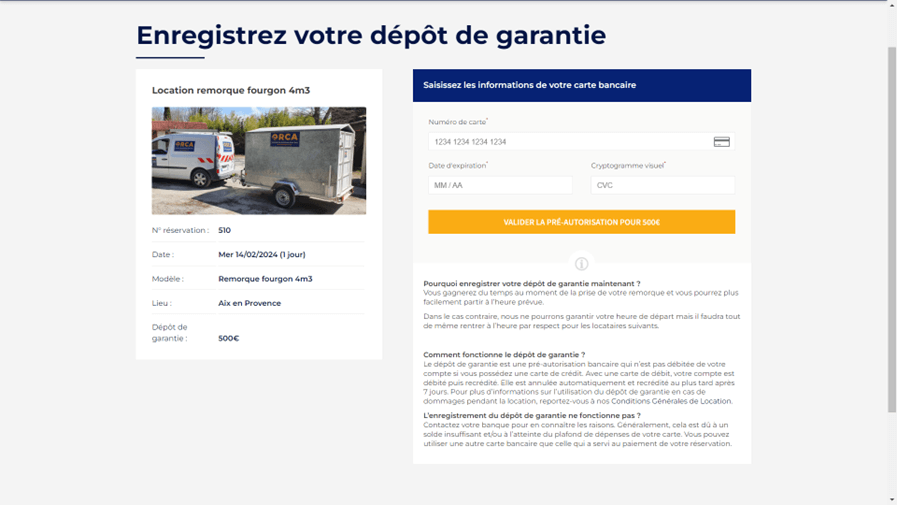 Vous pourrez demander à vos clients d'effectuer le dépôt de garantie avant leur location sous la forme d'une autorisation réalisée en ligne avec leur carte bancaire. En cas de souci, vous pourrez facilement charger tout ou partie de la somme pour vous dédommager.